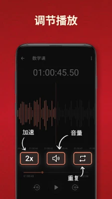 录制后的音频,**录音机Plus**同样提供无与伦比的播放体验。列表中的迷你播放器便于快速预览,而全屏播放器则解锁更多高级控制。您可以自由调节播放速度,从0.25倍慢速细品,到2倍快速回顾,还可轻松拖动进度条,精准跳转至录音的任一时刻。当您想与世界分享您的精彩瞬间、宝贵笔记或动听歌声时,录音机Plus的社交媒体分享功能让这一切变得轻而易举。